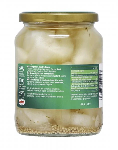 Eingelegt mit vielen kleinen Senfkörnern und traditionellen Gewürzen schmecken die hellgelben Senfgurkenstückchen köstlich delikat. Aus jedem Glas fischen Sie zu 100% Gurken aus dem Spreewald, handverlesen und ausgezeichnet mit der Herkunftsgarantie. Damit „besenftigen“ Sie jeden Kenner.